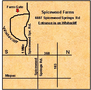 From Mopac: Take the Spicewood Springs Rd/Anderson Ln. exit. Go W on Spicewood Springs Rd, until you come to Loop 360 (Capital of Tx Hwy). Turn South (left) on 360. Turn R at first stoplight which is Spicewood Springs Rd. again. Go approx. 1 mile. Turn L on the first Whitecliff. It is a short horseshoe-shaped road. Our Farm gate will be